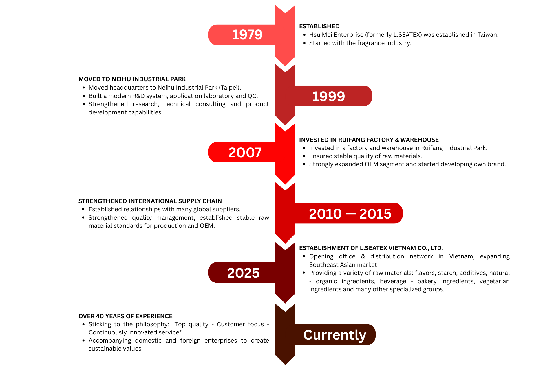 L.SEATEX is a Taiwanese corporation, the predecessor of Hsu Mei Enterprise, established in 1979 with more than 40 years of experience in the food ingredients industry. From the initial flavoring business, the corporation has expanded into a supplier of hundreds of food ingredients, including additives, natural and organic ingredients, biochemical ingredients, concentrated juices, alcohol and other specialized products. With a modern R&D system, application laboratory, QC in Taipei and a factory – warehouse in Ruifang Industrial Park, L.SEATEX ensures stable quality of raw materials and strongly develops the OEM – private brand segment.